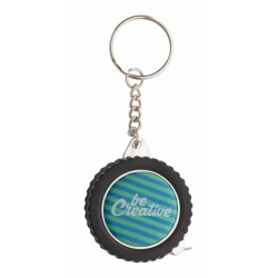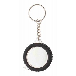 Kerék alakú fém kulcstartó 1 m hosszú mérőszalaggal.
