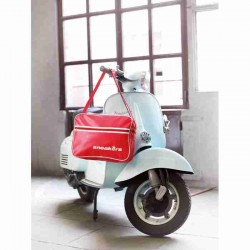 Matt PVC oldaltáska fehér díszítéssel és szegéllyel. Cipzározható elülső zsebbel. Állítható vállpánttal.