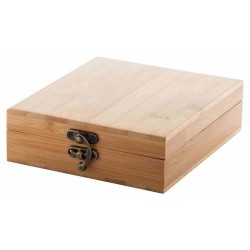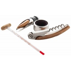 4 részes faberakású boros szett bambusz dobozban, mely bornyitót, cseppőrt, kiöntőt és borhőmérőt tartalmaz.