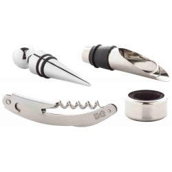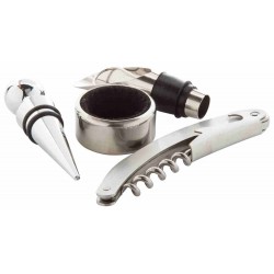 4 részes boros szett, mely dugóhúzót, cseppőrt, dugót és kiöntőt tartalmaz. Fekete díszdobozban szállítjuk.