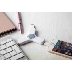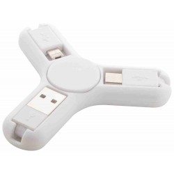 Műanyag fidget spinner USB töltőkábellel, micro USB, Type-C és Lightning csatlakozókkal.