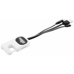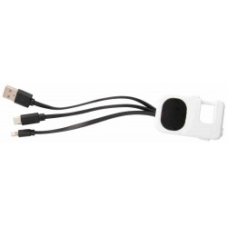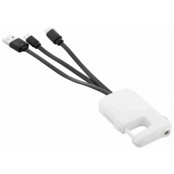 USB töltőkábel műanyag karabinerrel és 1 LED-es zseblámpával. Micro USB, USB Type-C és Lightning csatlakozóval. A logózható lemez mögött LED-es világítással, mely megvilágítja a gravírozott emblémát. Gombelemmel szállítjuk.
