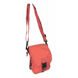 Műanyag csatos oldaltáska, 2 db cipzáras rekesszel, karabineres vállpánttal. Anyaga: 600D poliészter.