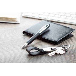 Elegáns, műbőr pénztárca fém/műbőr kulcstartóval és golyóstollal. Díszdobozban, kék tollbetéttel szállítjuk.
