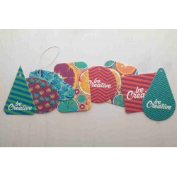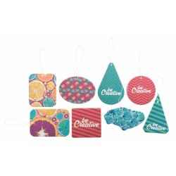 Egyedi gyártású autóillatosító különböző formában és illatban (zöld alma, trópusi, mentol, citrom, tenger, új autó, eper, barack, vanília). Full colour nyomtatással a termék mindkét oldalán. Minimális rendelési mennyiség: 250 db.