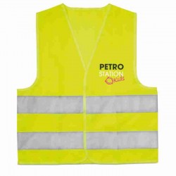 Láthatósági mellény gyerekeknek. Két fényvisszaverő csíkkal. Anyaga: 100% poliészter.